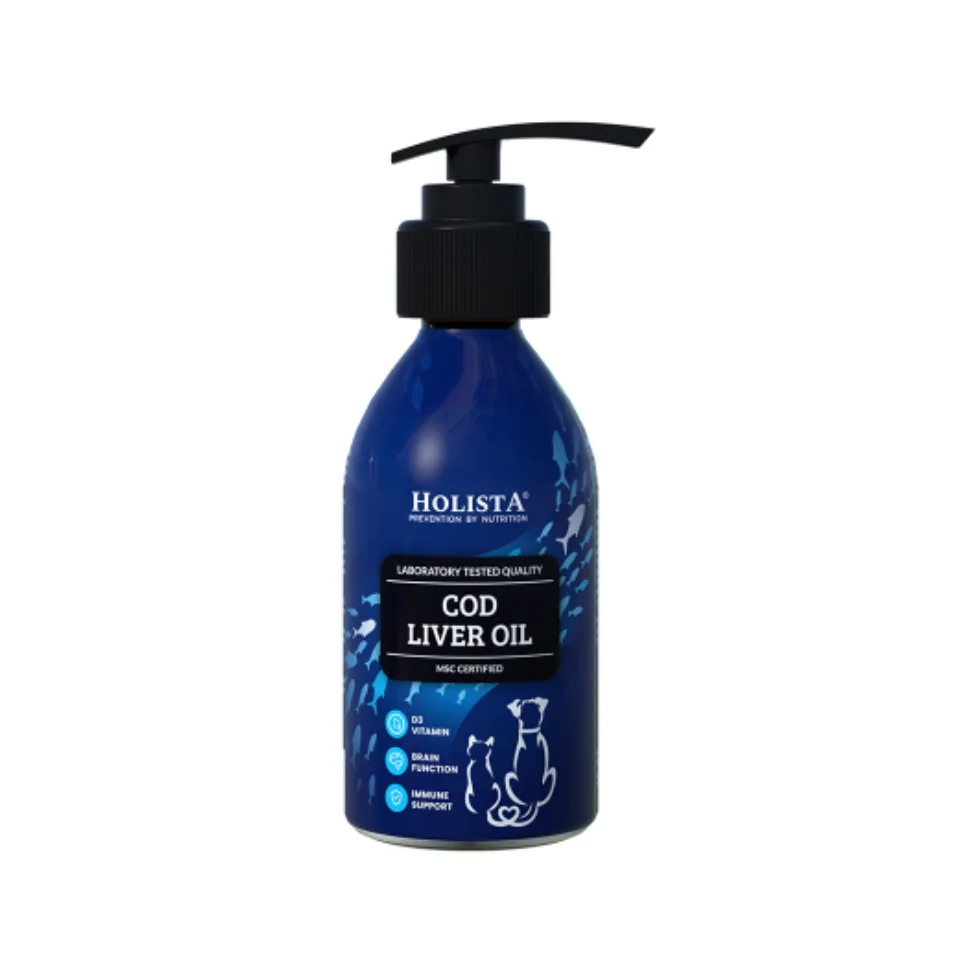 HolistaPets Cod liver Oil wytwarzany ze świeżych wątróbek dorsza (Gadus morhua morhua) złowionego w czystych wodach wokół Islandii. Produkt wolny od materiałów i komponentów modyfikowanych genetycznie, bogaty w kwasy tłuszczowe EPA i DHA oraz witaminy A i D. Psy i koty nie są w stanie naturalnie wytwarzać w swoich organizmach niezbędnych kwasów tłuszczowych Omega-3 dlatego tak ważne jest aby zapewnić naszym pupilom uzupełnienie tych kwasów w diecie za pomocą wysokiej jakości suplementów. Długołańcuchowe kwasy tłuszczowe omega-3 EPA i DHA wspierają pracę serca, nerek, wątroby, stawów, mózgu oraz oczu.